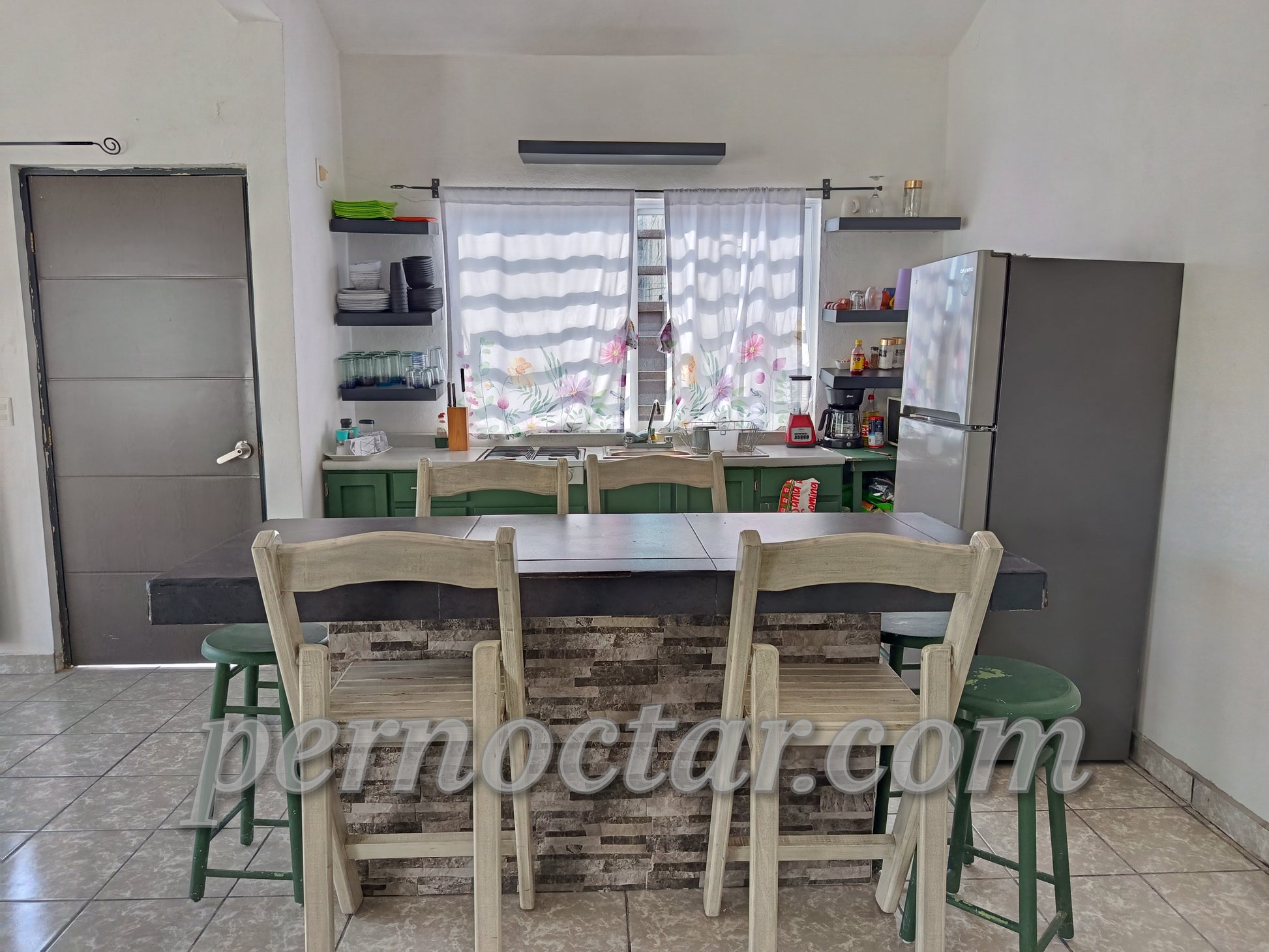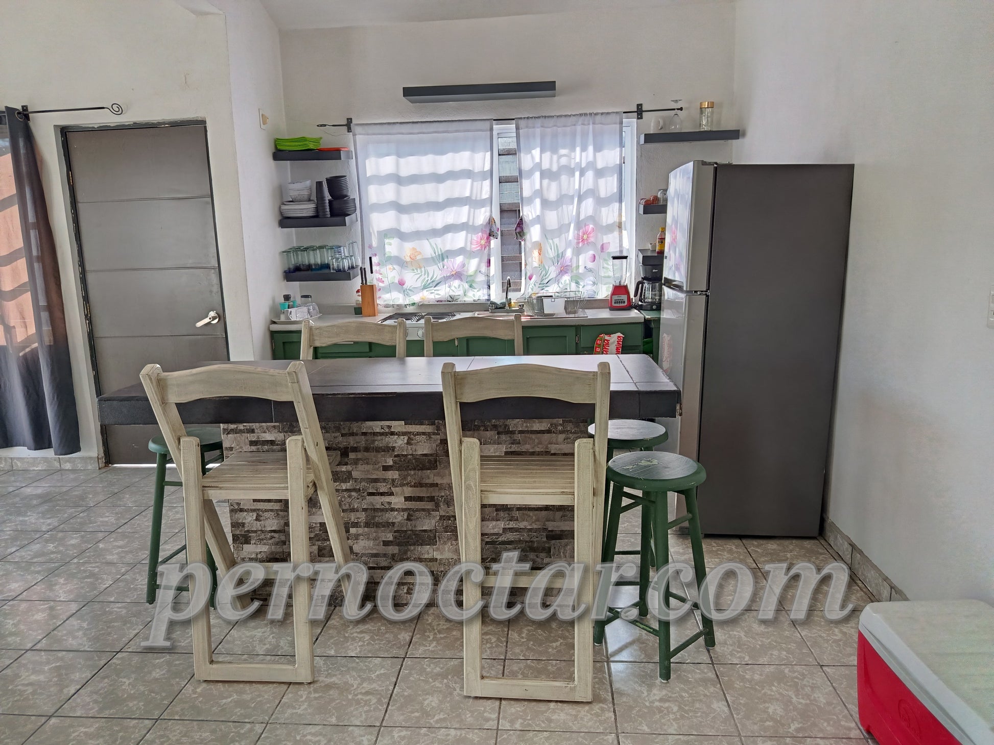 - Parrilla con 6 hornillas, refrigerador, microondas, cafetera, licuadora, hielera, tabla de picar, cacerolas, sartenes, vasos, platos, cubiertos, tequileros, copas, utensilios, . Isla con 6 bancos periqueros.