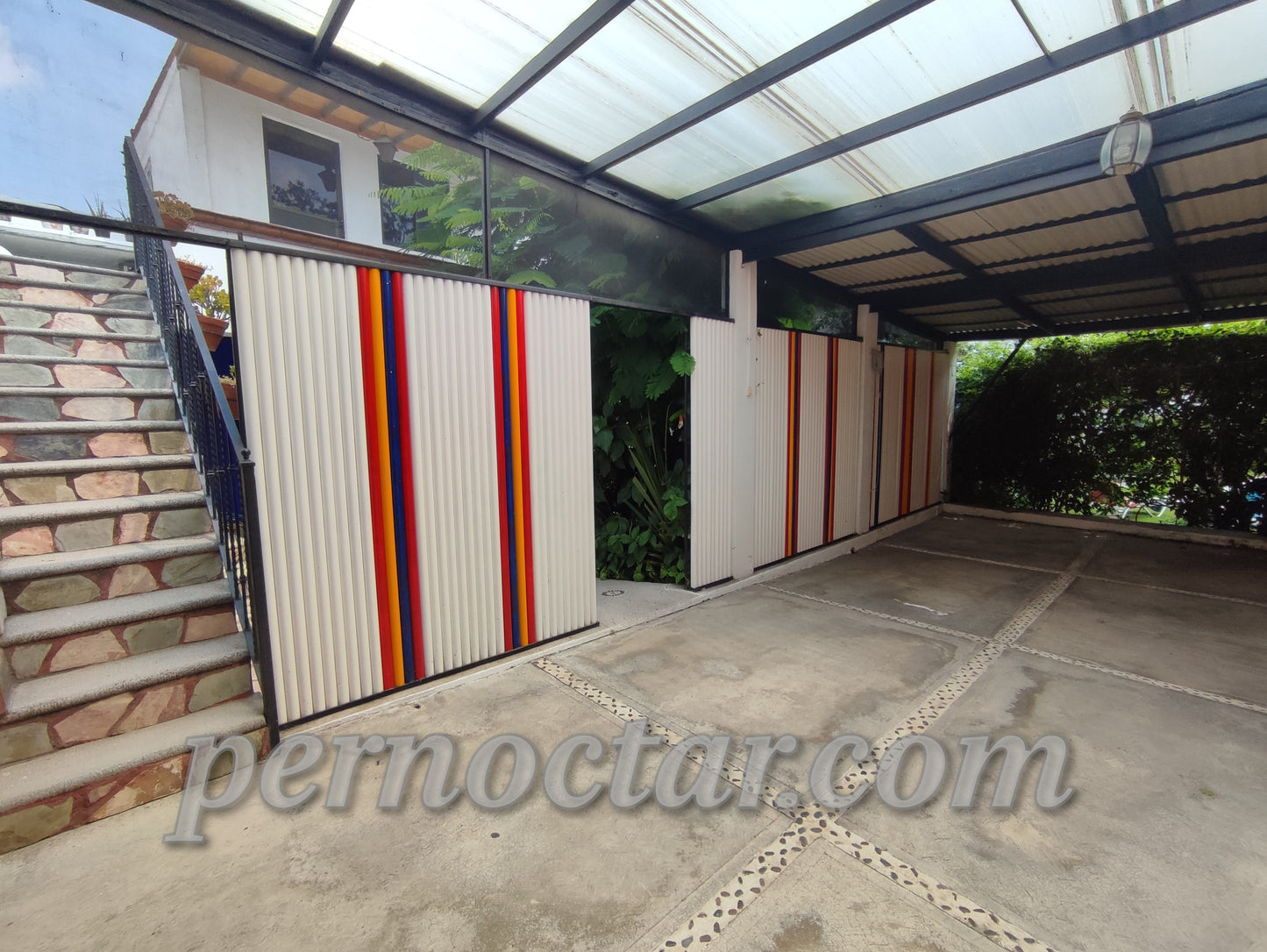 - Pérgola: mesa circular para 4 personas. Regadera, 2 camastros.