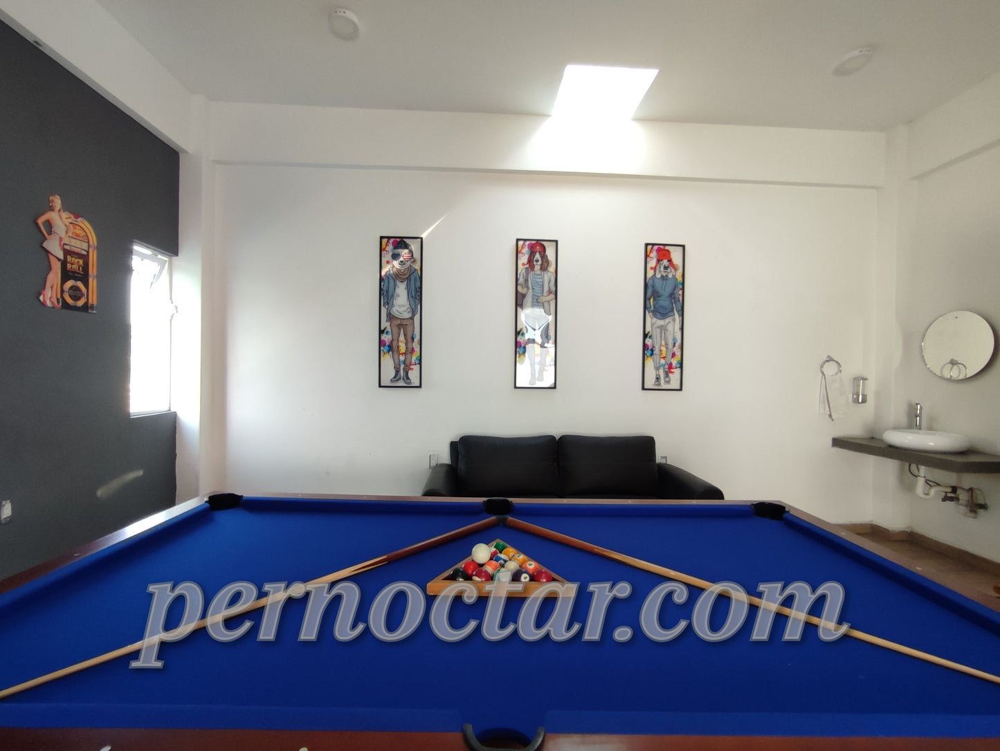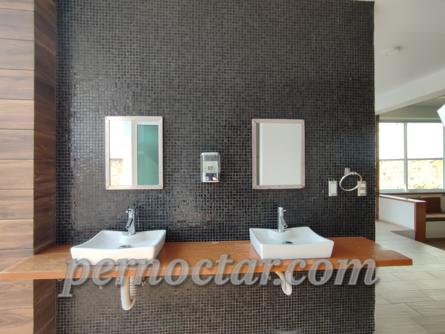 - Palapa. Planta alta: mesa de billar, sillón para 2 plazas, vestidor, sauna, baño completo. Bar: 8 mesas, bancos periqueros. Barra, tarja, bancos, copas, vasos, tequileros, 2 medios baños (hombres y mujeres).