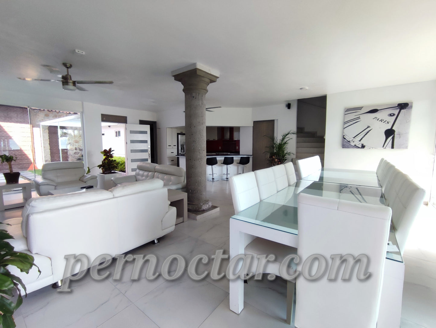 - Se presta envase de garrafón. Se proporciona: jabón líquido en cada baño, papel higiénico, toallas para manos, toallas para cuerpo, 15 toallas para alberca. Favor de llevar artículos de aseo personal. Termómetro para la alberca a la vista de los huéspedes. Se proporcionan bolsas para basura, jabón para trastes, trapos para limpiar. Cuenta con Wi Fi y TV con cable. Se acepta renta para grupo de amistades con previa autorización para casos específicos, garantía reembolsable $6,000 (consultar con su asesora). Acepta eventos pequeños de máximo 40 invitados con costo extra (adicional a la capacidad de la renta de la casa, consultar con su asesora). Adicional al contrato, se debe respetar el reglamento adicional de la propiedad. Propiedad a 5 minutos de Oxxo, carnicería, tortillería, tienda de abarrotes, panadería, restaurantes y fondas. Cerca de lugares en renta para moto acuática, buceo, lancha, esquí acuático, paracaidismo, globo aerostático, bungy. A 5 min. de la Hacienda Vista Hermosa y cerca de varios jardines y salones de eventos. CCTV en jardín y estacionamiento. El precio sugerido de la caldera depende del costo del gas, clima, época del año, tamaño y profundidad de la alberca. La alberca tiene cubierta térmica. Ventilador de techo. Aire acondicionado. Camino con un poco de terracería. Se pueden dejar más autos en el frente de la propiedad. Propiedad en cerrada con vigilancia las 24 horas. Futbolito. Mesa de billar. Mesa para juegos de cartas. Prohibido el acceso al cuarto de máquinas, manipulación de llenado de tinacos. Del estacionamiento (nivel de calle) hacia la alberca (orilla del lago) hay 5 escalones.